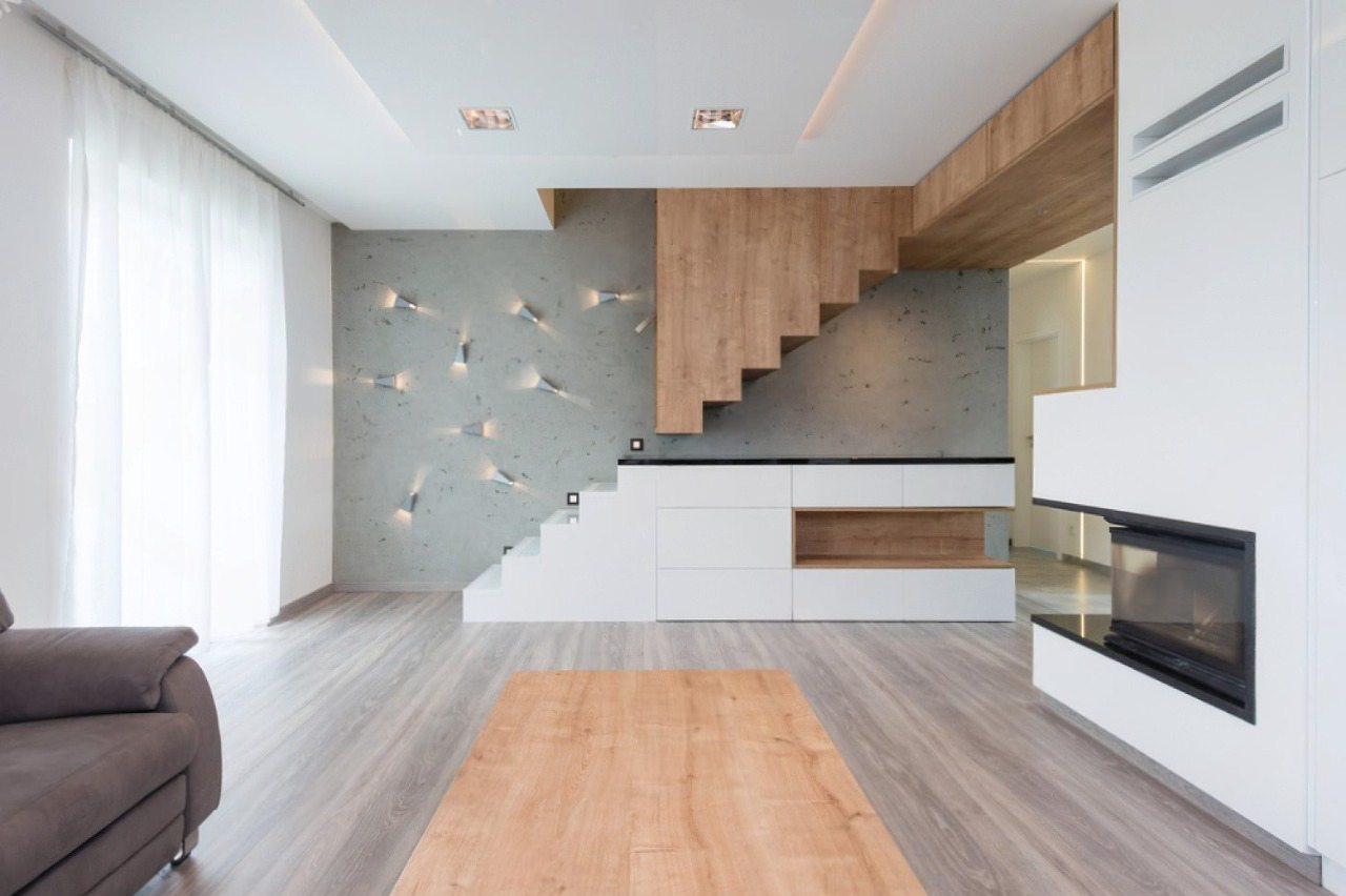 Основание лестницы представляет собой монолитный белоснежный подиум, на который установлена столешница из искусственного камня. Верхний марш выполнен в виде «парящего» короба. Технически, это сложная консольная конструкция, которая крепится к капитальной стене, что и создает эффектный образ зависшего в воздухе элемента. Весь ансамбль смотрится как единое, гармонично спроектированное пространство.