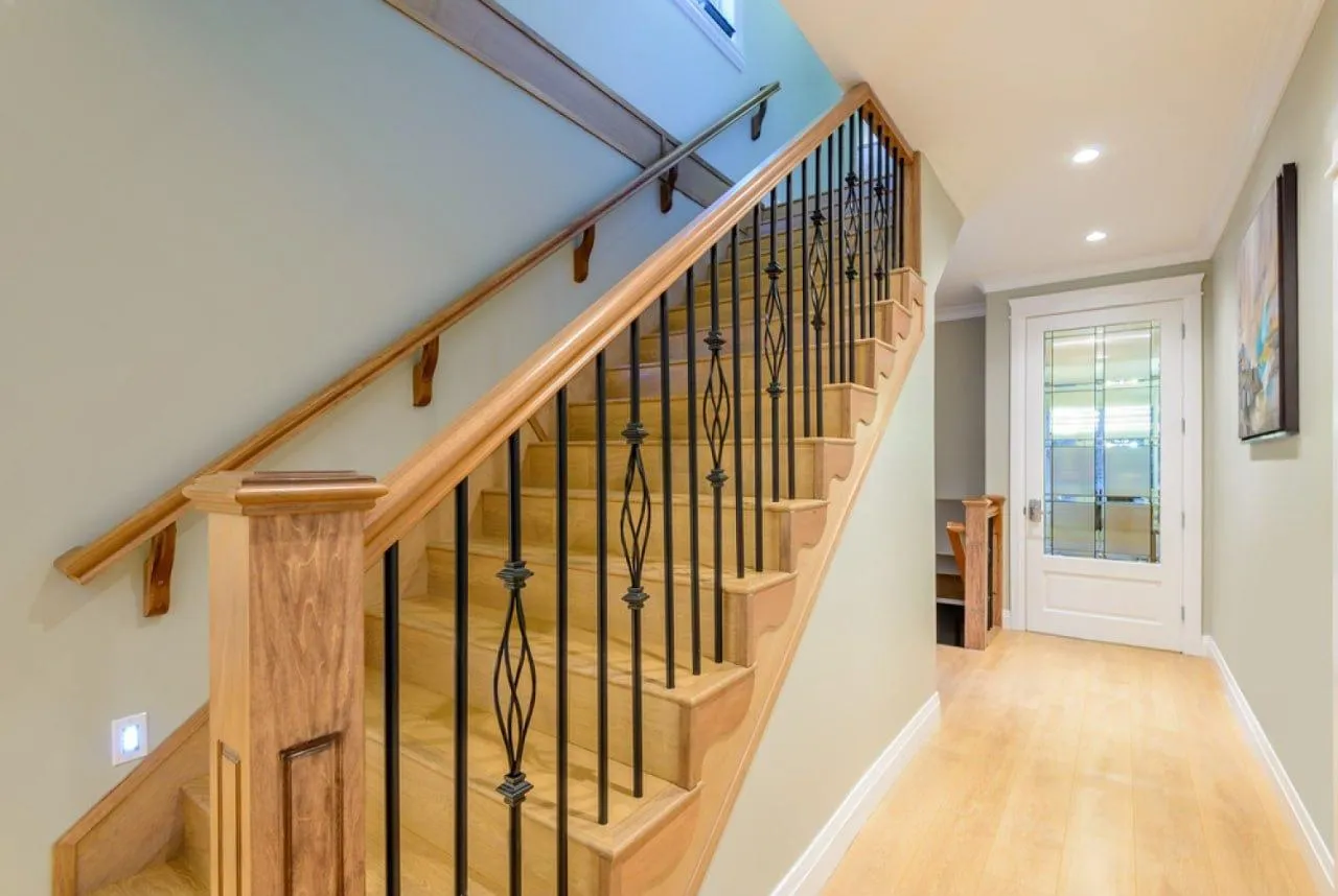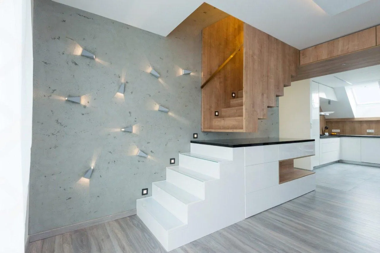 Идея для вашей лестницы: Рассмотрите возможность интеграции "умной" подсветки. Светодиодная лента, встроенная под ступенями или вдоль стены, не только добавит эффектности в вечернее время, но и повысит безопасность, мягко освещая путь.